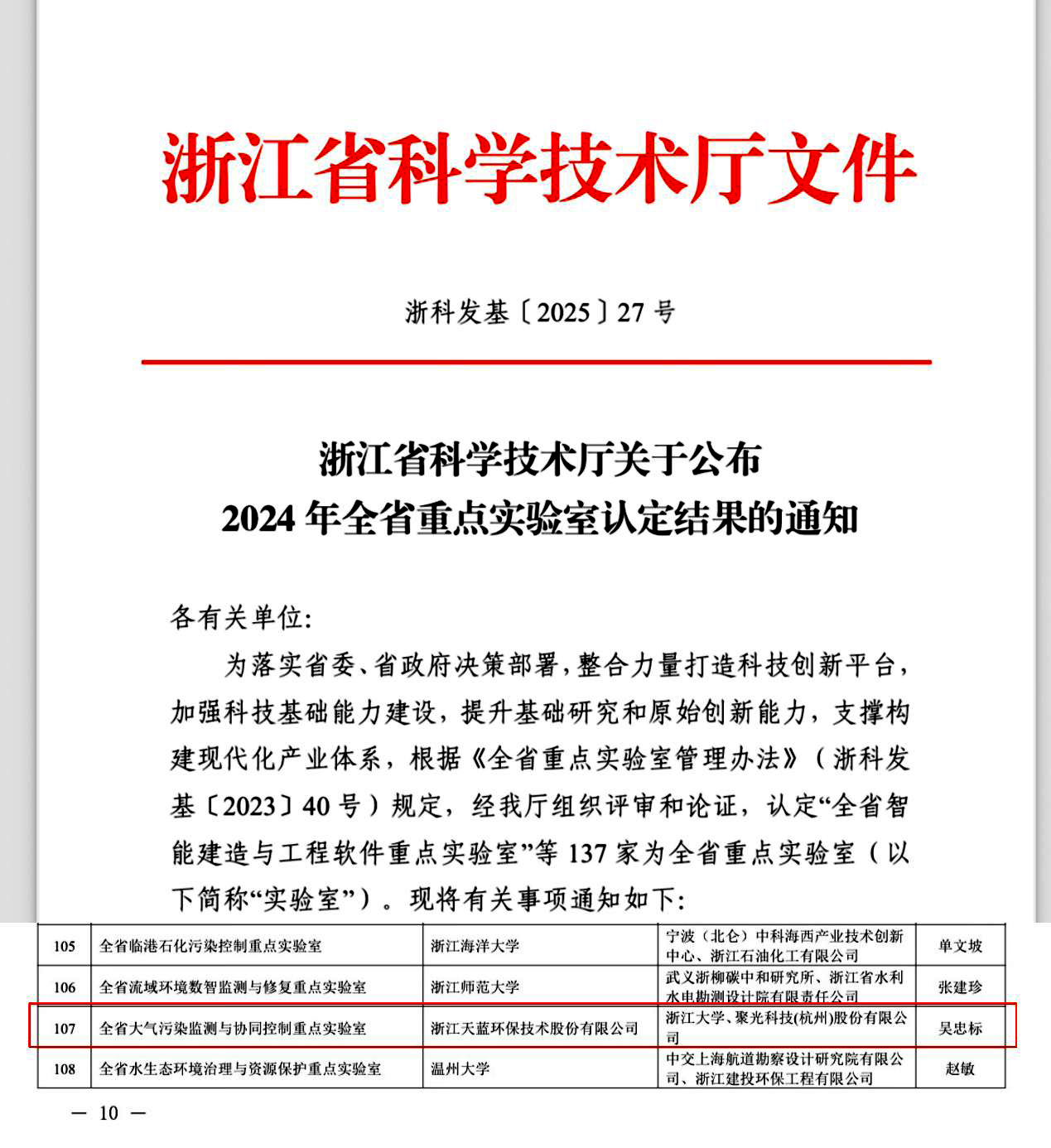 2025年6月4日,浙江省科技廳發布《浙江省科學技術廳關于公布2024 年全省重點實驗室認定結果的通知(浙科發基〔2025〕27號)》,由浙江天藍環保技術股份有限公司牽頭,浙江大學和聚光科技(杭州)股份有限公司共建的“全省大氣污染監測與協同控制重點實驗室”獲批組建,成為全省環境領域唯一以企業牽頭建設的省級重點實驗室